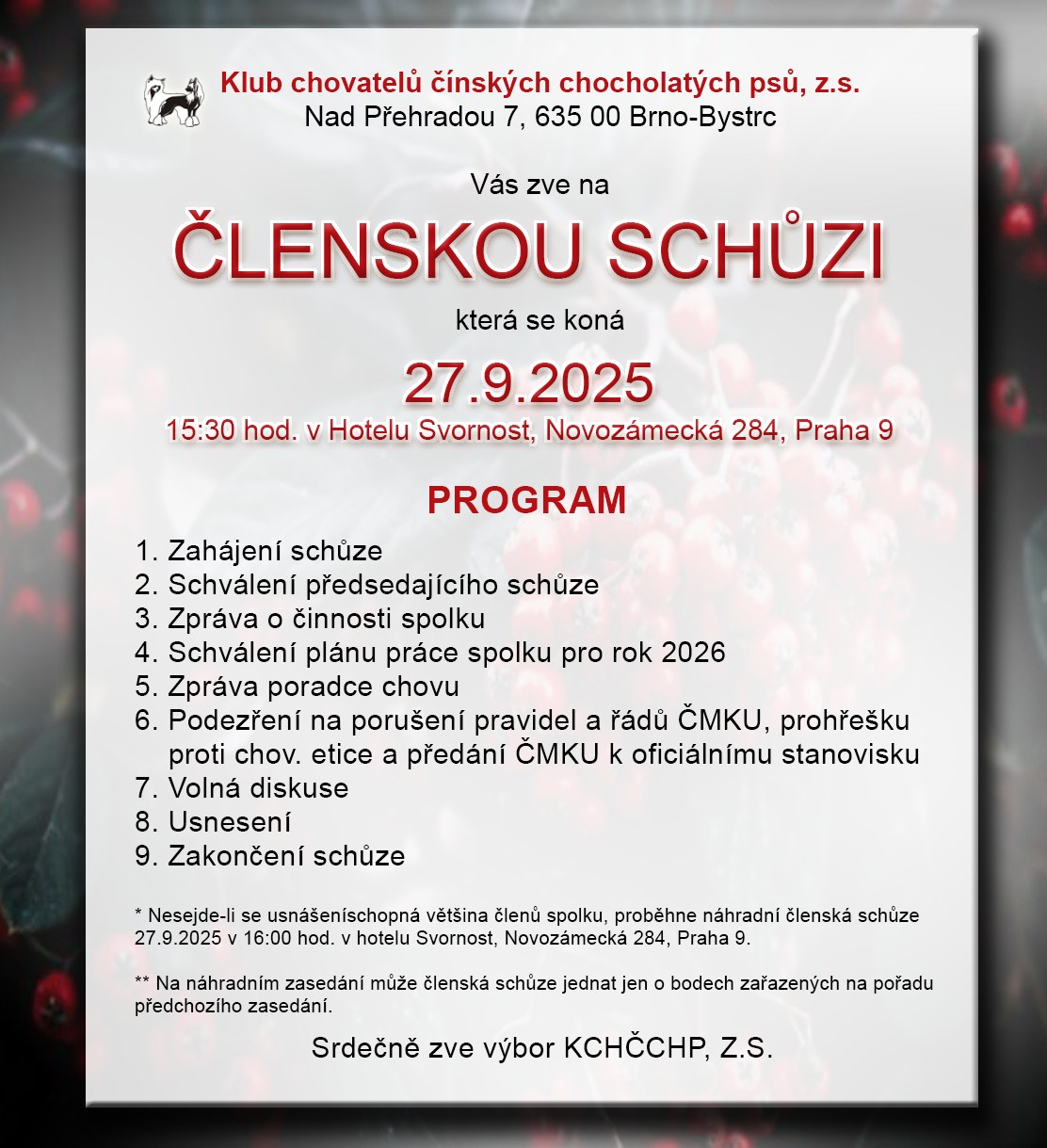 Dne 1.12.2016 byl Klub chovatelů Čínských chocholatých psů, z.s. schválen jako prozatímní člen ČMKU.